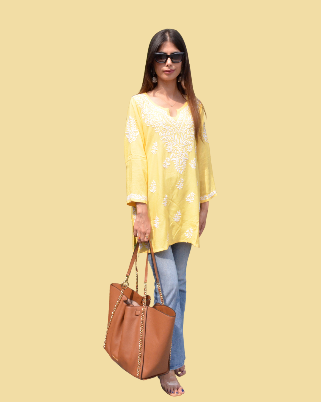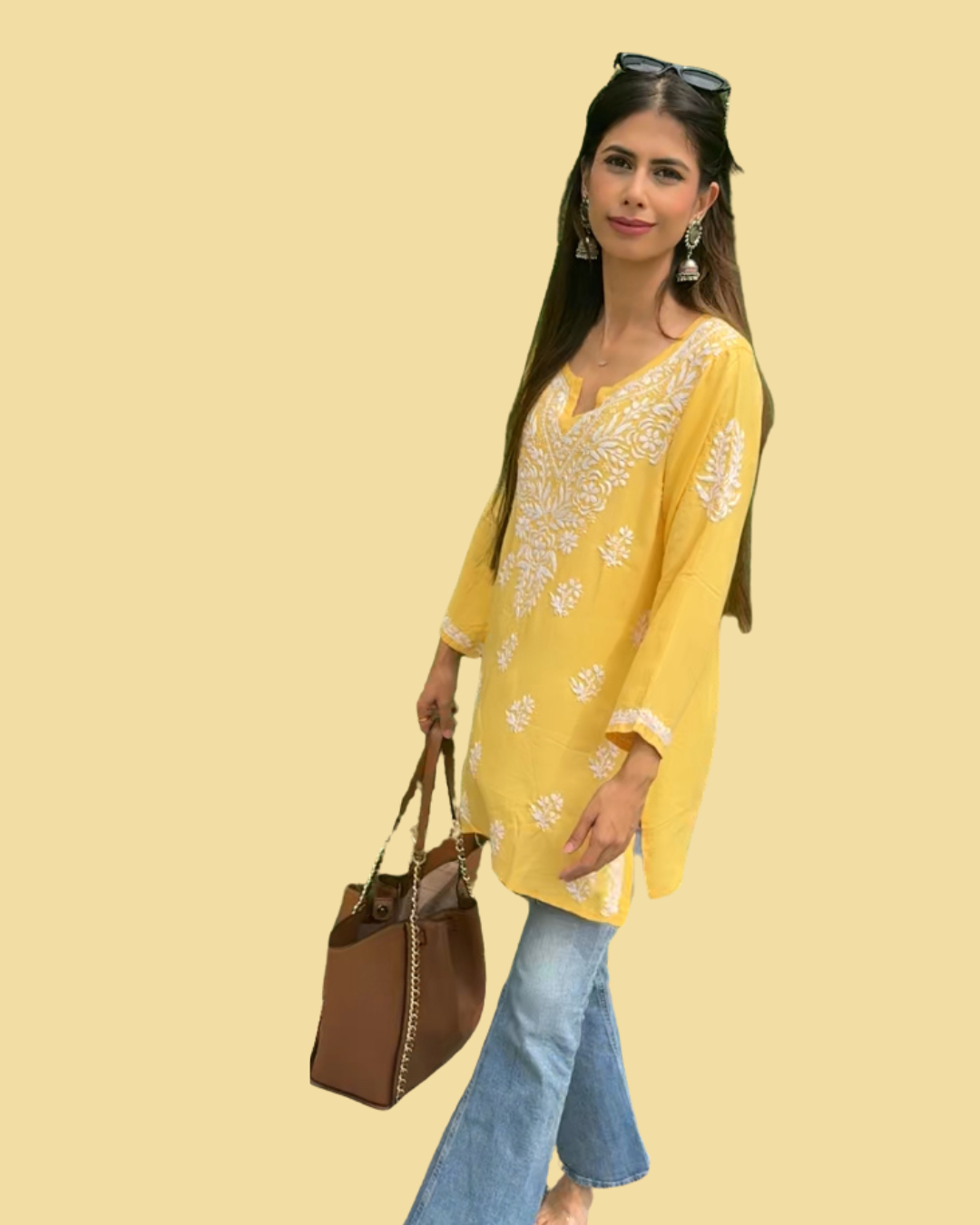 Lucknowi  Chikankari  Rayon Short Top-Sunshine Yellow
